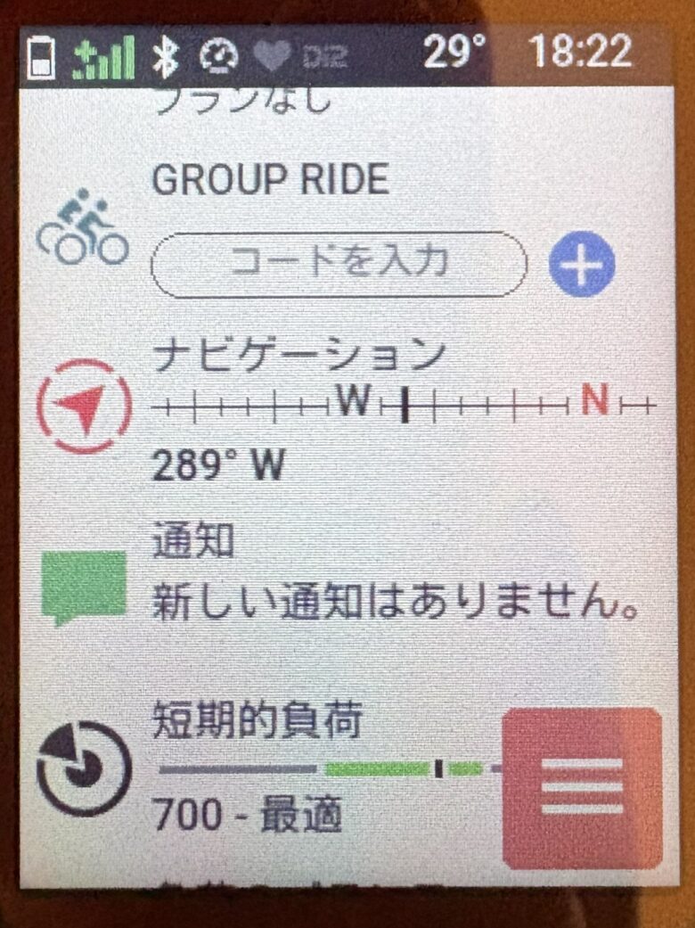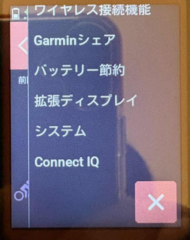 写真のように、Garmin Edgeのメイン画面の右下の3本線をタップしてメニューを表示させます。